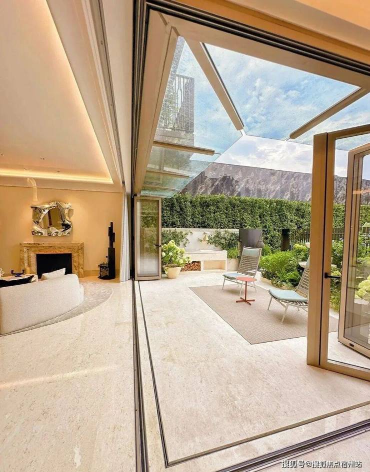 「无界空间」:客厅270度转角无柱设计,搭配落地玻璃,开阔视野将院中风景迎入日常。
