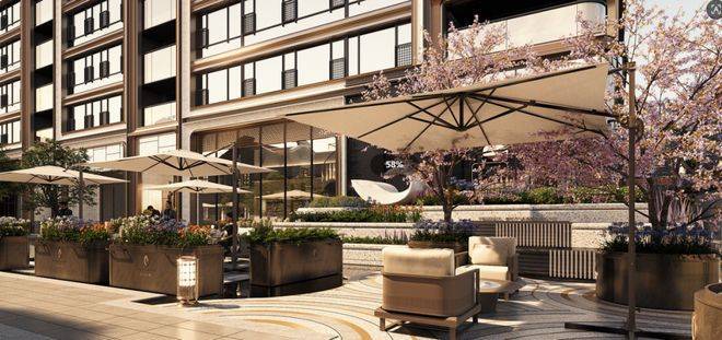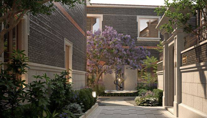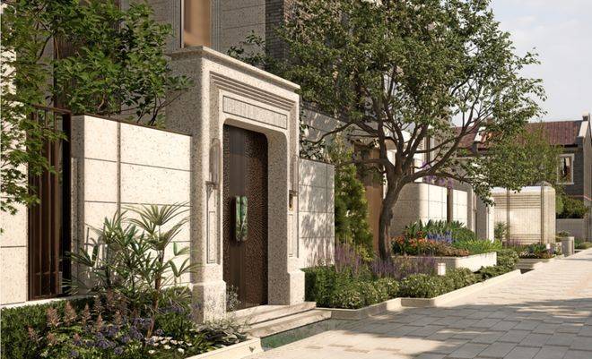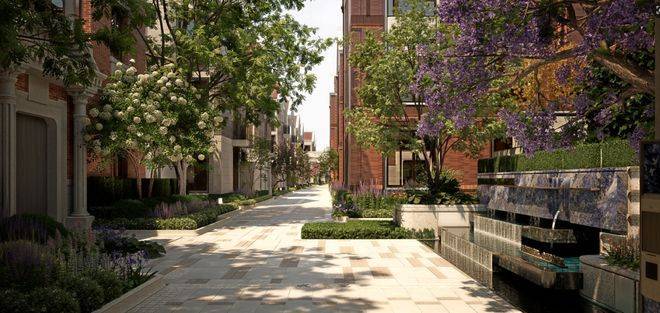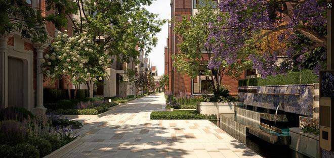 景观设计以 “历史印记 + 生态融合” 为核心,打造 “一横两纵三个轴线” 的景观格局,融合海派花镜与名贵树种,形成自然生态调节系统。提取北外滩历史元素(如新民机械厂场地印记),融入八大景观场景,实现历史记忆与现代景观的共生。植物设计打造礼仪之门、生态林境、花镜步道等多重亮点,搭配水系与景石,营造四季有景的生态氛围。别墅入户设置专属花园,高层推窗可见江景与社区景观,底层架空空间与景观轴线贯通,形成 “全域景观渗透” 的布局,让业主在居住中感受自然与文脉的双重浸润。