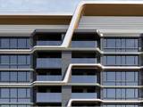 住宅立面也大胆选用珍珠蓝、香槟金、海派砖红等鲜明色彩,搭配约270°圆弧造型,在千篇一律的黑白灰建筑群落中脱颖而出,成为城市美学新地标。