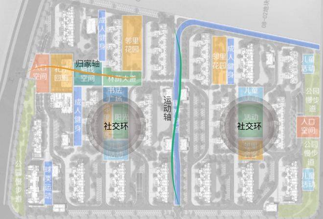 运动轴-中央康养跑道,200米南北景观中轴,形成社区活力之源;社交环-社区中央会客厅,邻里花园、阳光草坪、儿童活动区、书法广场,聚合社交共融生活环;三组团-邻里花园+成人健身双组团,球类运动竞技组团。