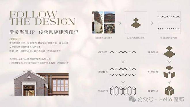 超级符号:菱形超级符号统一运用,室内、景观铺装、单体立面一体化延续