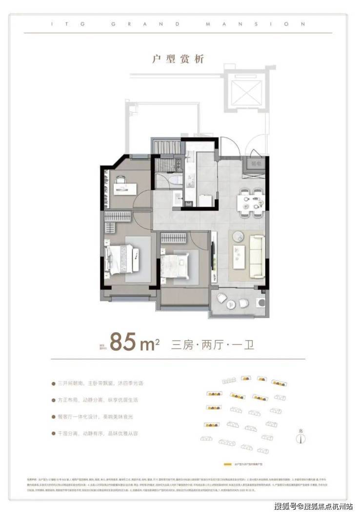 约85㎡三房:实现了三开间朝南,南向面宽约9.6米。该户型通过一体化设计和减少过道,在有限面积内做出了三个房间。