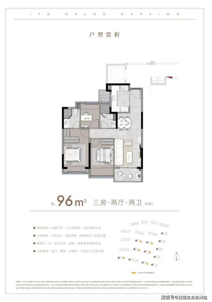 约96㎡三房:做到了三房两卫,主卧为套房设计。南向面宽约9米,带有双阳台。