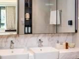 卫浴墙面采用寒江雪大瓷砖铺装,淋浴部分地面选用整块天然大理石。