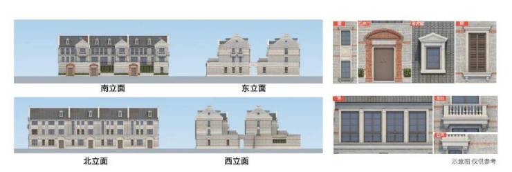 弘安里新组团风貌别墅,采用大面青砖、局部红砖腰线与仿木铝合金门窗的立面做法,延续人字形山墙的形制,屋面承袭传统小青瓦工艺,更新老虎窗。在1.1的容积率下,优化组团关系与建筑的巷弄与檐口的比例,越弘安里入口的过街门楼,踏入巷门,拾步院门,由园入院,沉浸四季的花园之境。