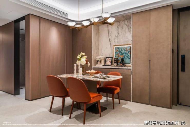 客餐厅一体化,外接南向大面积观景阳台,整个公区视野开阔,尺度阔绰。