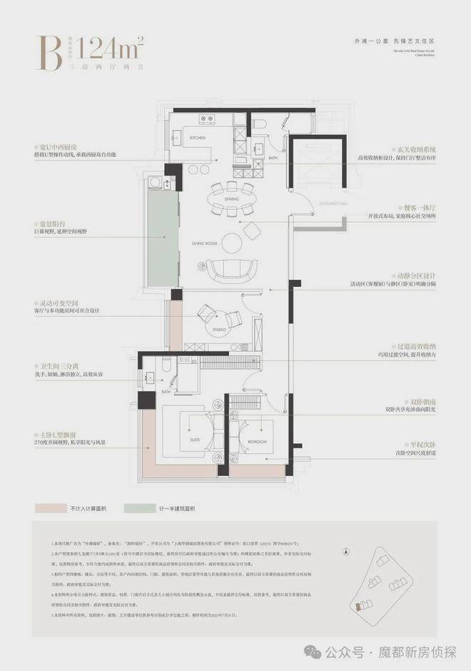 香奈儿美学:三开间朝南+LDKB一体化设计+全卧室飘窗,主卧套房私密,独立卫浴+衣帽间,270°转角飘窗阻隔外界视线;