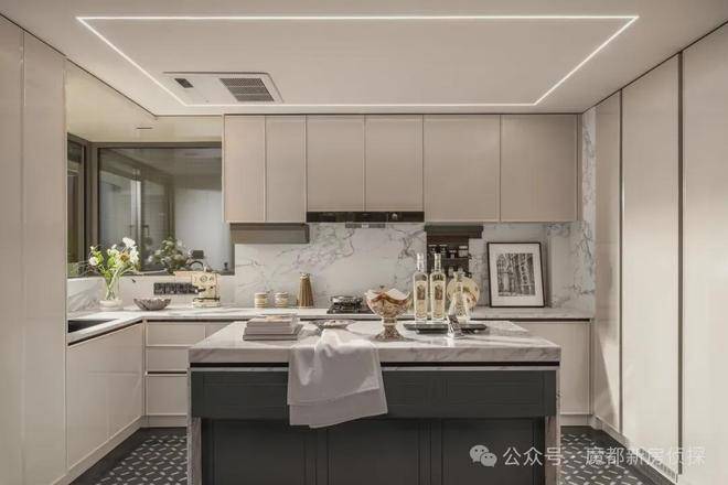 厨房更是拥有别墅级大空间,通铺中央空调、地段,甚至还有交付的奢石大岛台。