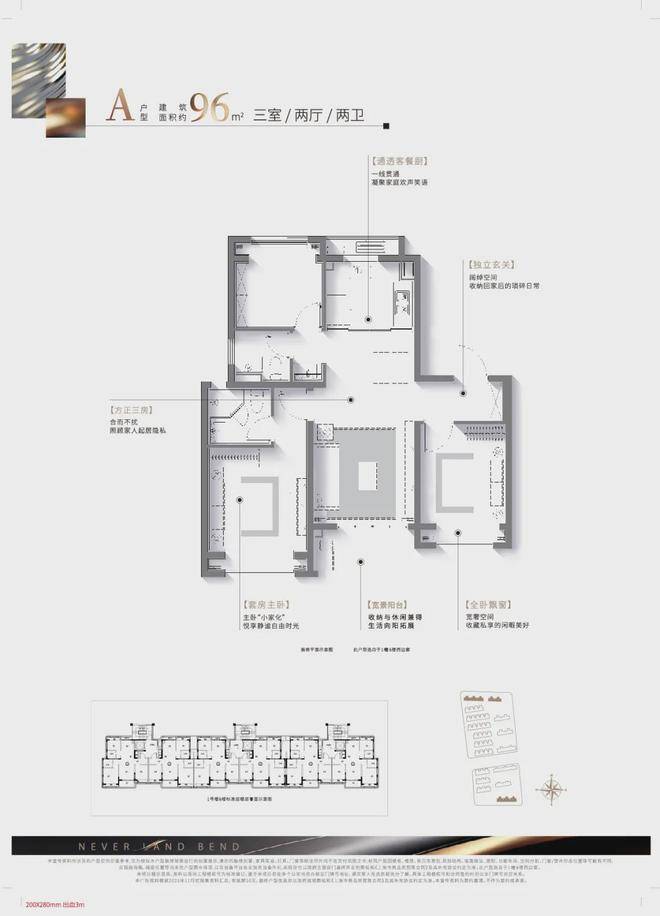 建面约96㎡精质三房,一步到位舒适人居: 该户型方正格局、南北通透无连廊,既容纳二人世界的浪漫,也可将三口之家的幸福一并珍藏。