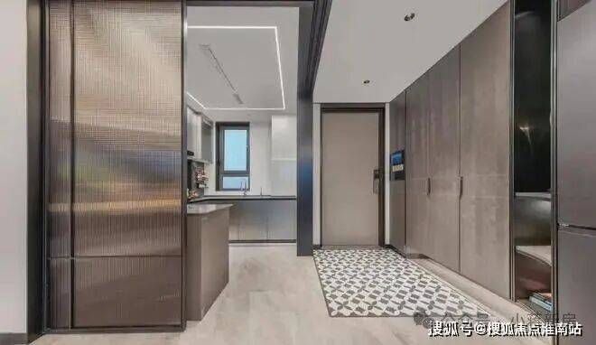 宽约 1.1 米、高约 2.4米的大门 ,通高设计, 远胜于常规 2.35 米高带来的仪式感, 而且材质上用的精雕铸铝门设计,门以太阳为源,搭配周围精雕光束线条,宛若光芒耀眼的小太阳。表面雅韵金棕色,在光线下,波光粼粼,宛若一片辽阔宽广的金色海洋,经过近百次的打样,才形成这样的纹路, 让门也变成一件“艺术品” ,也让归家充满仪式感。