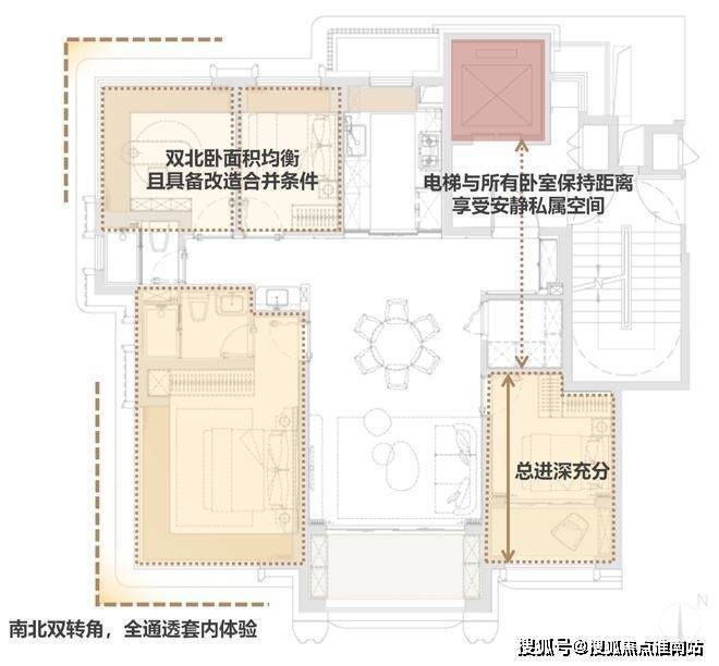 南卧面宽约3米,在设计上远离电梯,可以享受静谧睡眠。