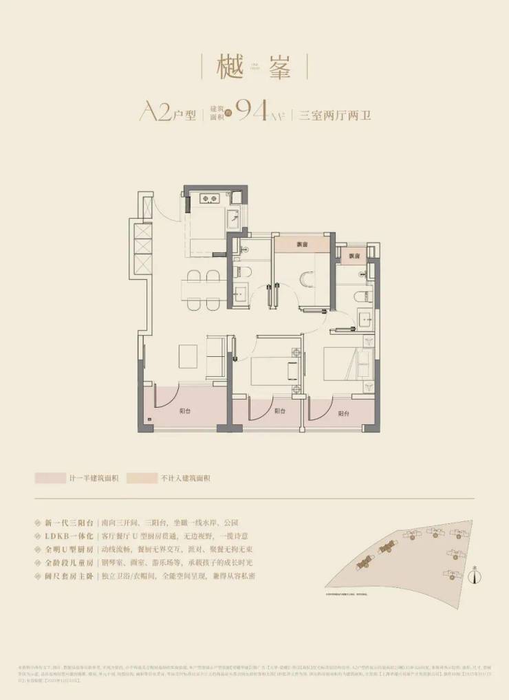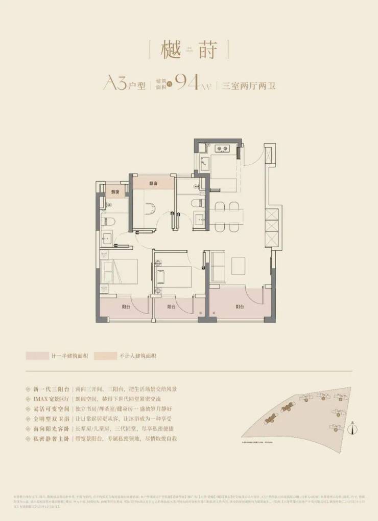 大华望樾建面约94㎡高层户型居然做到了三阳台的配置,远远超过新规标准。