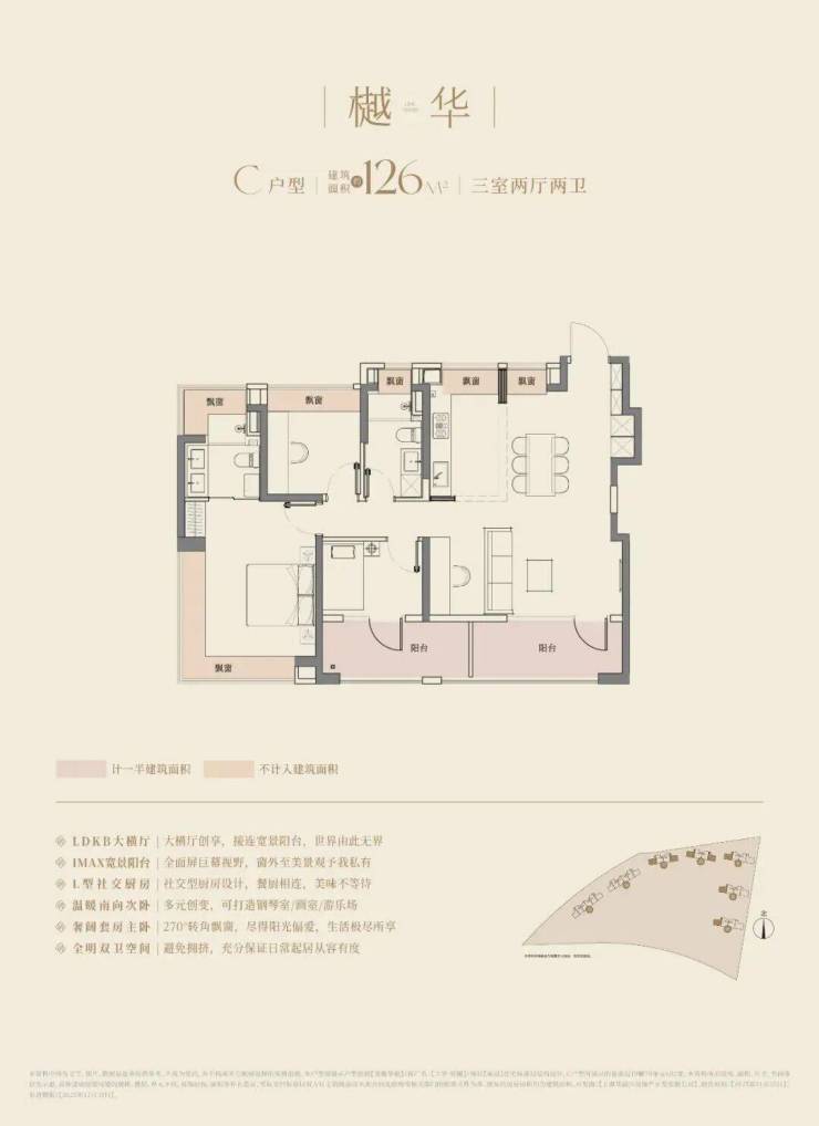 建面约128㎡户型则是双阳台+6飘窗的配置。要知道项目户型飘窗有可能采用非承重结构,交付后可改造为储物空间或拓展室内面积。