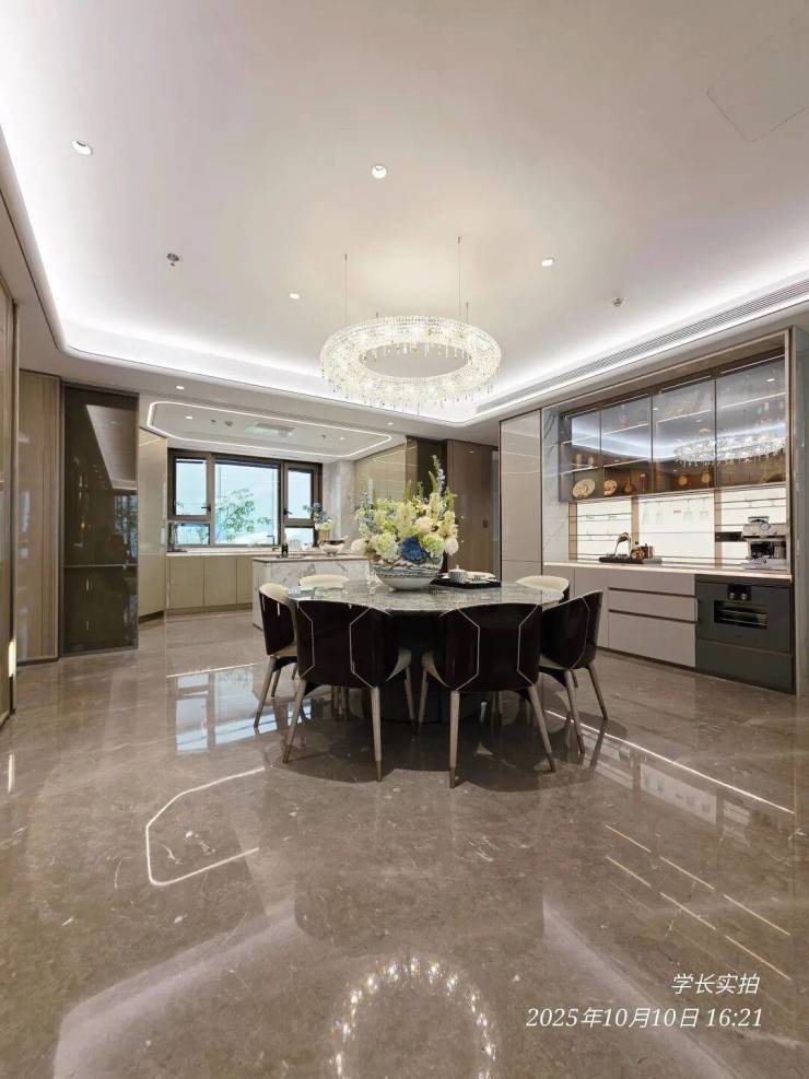 超30㎡餐客方厅采用一体化布局,巧妙地连接南向阳台、U型厨房,形成极佳通风采光通道。轻松容纳6人餐桌,无论是三代同堂的日常用餐,还是周末的家庭聚会,都能从容应对。