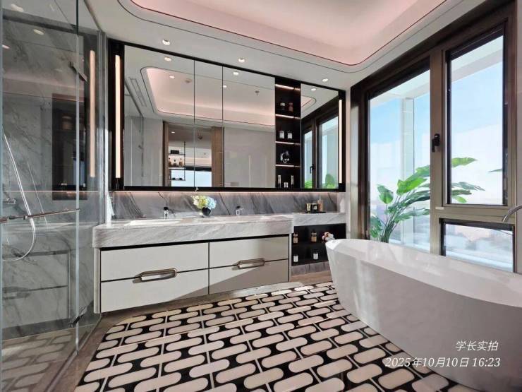 这是125㎡样板间的“女神卫浴”空间,专门利用镜面光、顶光、侧边光墙打造了一个协同光域场,让你站在镜前不会感到传统光源的刺眼,光线均匀柔和洒下,让你在梳妆时每个细节都纤毫毕现。