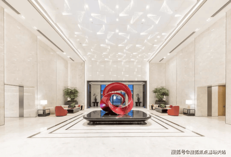 再来看看人行入户大堂,挑高的精装大堂搭配宝华标志性的太阳花装饰,连天花板都嵌入了星空灯光,整个大堂仿若拥有了星级酒店的落客体验。