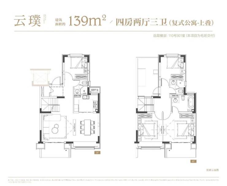 下叠户型4房2厅3卫,一层会客区,二层居住区,附带地下空间,可以根据主人喜好,定制成如健身房、酒窖、影音室、台球房等,任凭想象。