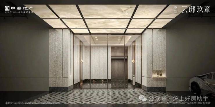 主入口约7米高约40米宽的奢华门头、挑高式的古铜色星空顶,地面选用天然大理石交织,进一步增强归家落客区的奢华感。