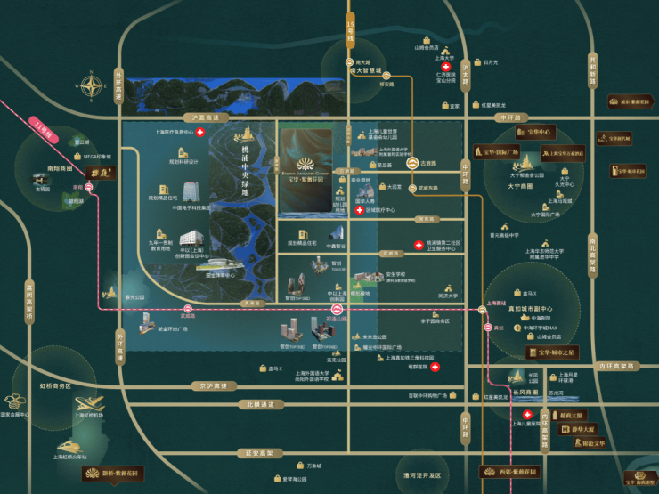 以中央绿地为轴,依托政策优势,构建功能组团,推动产业集群发展、区域规划落地,打造全新的上海市中心国际社区。