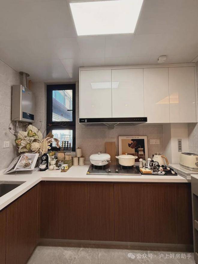 厨房采光面大且正对餐厅,东线布局合理,厨房U形布局使用率高;