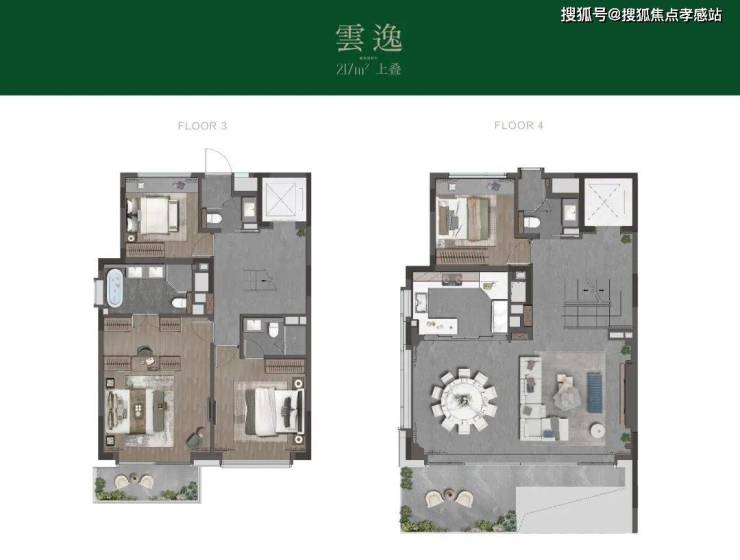 先看3-4层的主体空间。和其他常规上叠3层会客厅+4层起居室不同,项目将会客空间放在了4层,这是为了和顶层露台会客聚会功能整合在一起,形成更加合理的动线。