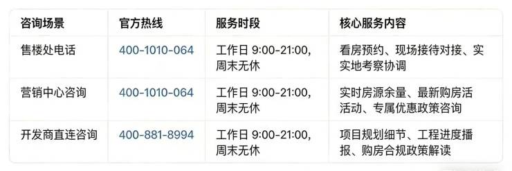 开发商售楼部热线:400-1010-064(开发商直连,解答项目规划、购房政策等)