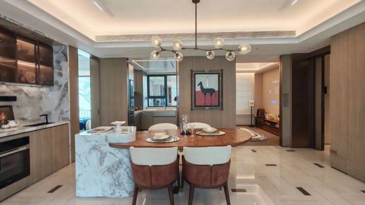 样板间中岛台及餐桌椅为非交付标准,仅供参考。实际交付后可根据自身需求,借鉴此类功能与动线设计,打造理想餐厨空间。