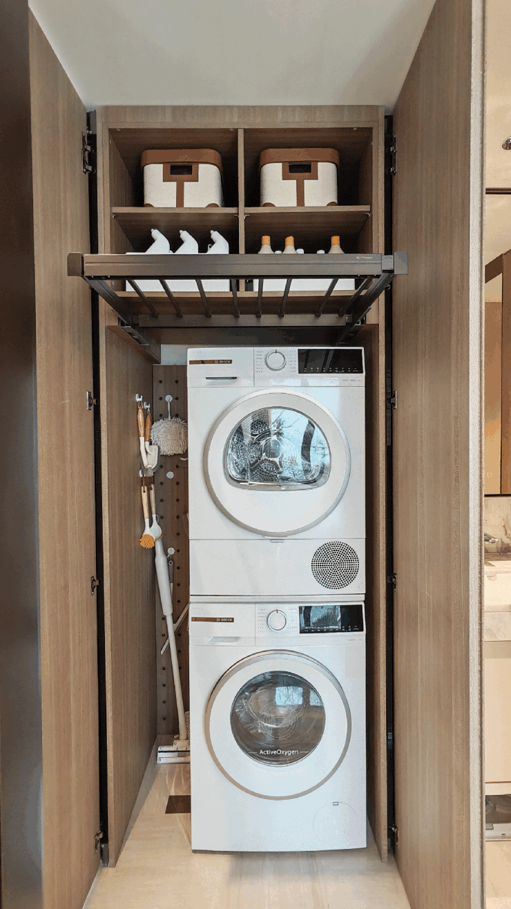 将洗烘套件与公卫结合,规划为复合功能区。旁边预留了充足的空间与洞洞板,用于有序收纳各类清洁工具。外侧设有可隐藏的柜门,将这些生活琐碎完美隐藏,时刻保持空间的视觉清爽。