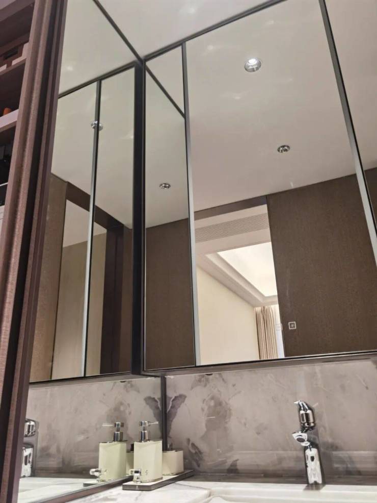 传统公卫只有单侧的镜面,如果近视的话,洗脸照镜子需要往前探身,很是不便。本项目完美的解决了这个细微处的痛点,在靠近洗烘区的墙面上增设了通长镜面,这样转头就能照镜子,不用前倾探身,这种对小细节的升级足以看出开发商对各种人群生活习惯的深度洞察。