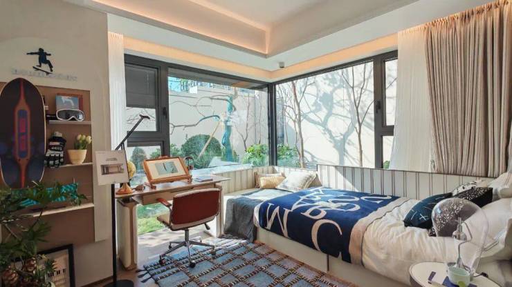 约3.25*3.75米的室内净尺寸,本身就相当于传统主卧的大小,更有转角落地窗的加持,整个空间更显明亮与宽敞,真正能满足孩子从小学到大学的居住需求。