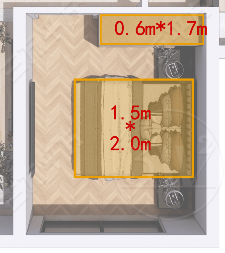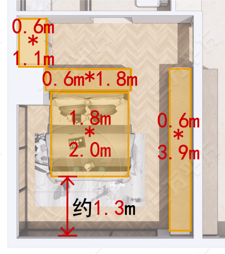 如若进一步扩容,可将主卧调整为度假式布局,将床头调转90度,在靠墙增设长约3.9米的超长衣柜,床头处增加衣柜,与现有衣柜形成步入式的衣帽间。在这种布局下,衣柜的总长度长达约6.8米,足以媲美建面约300平米豪宅的配置。