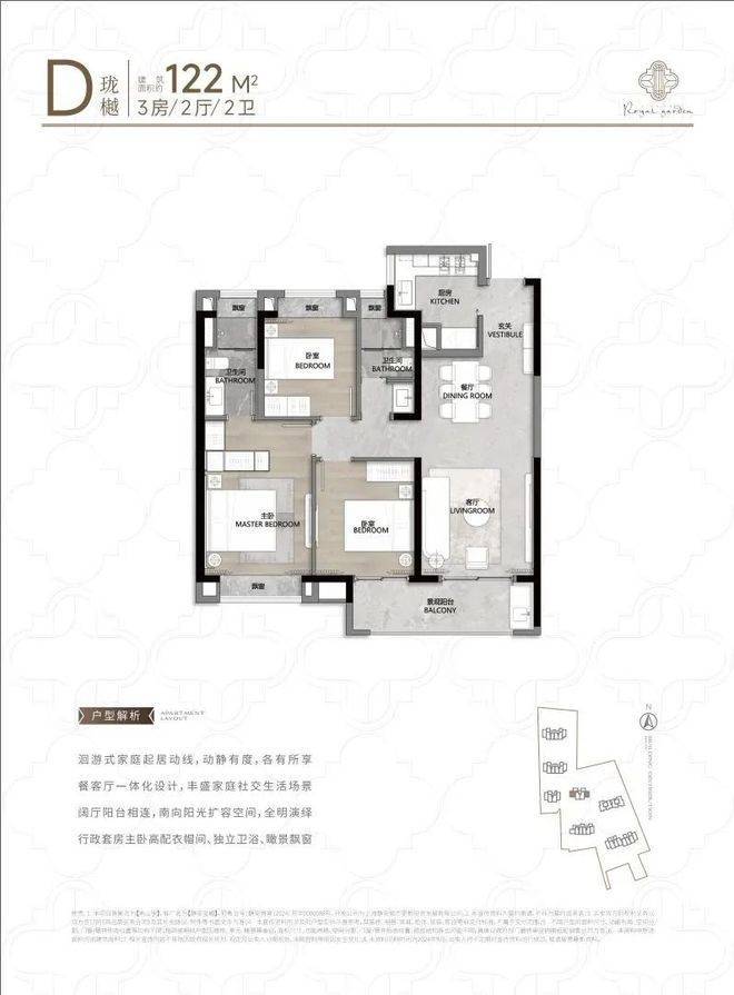 104㎡3户型特点: 该户型多为楼栋的 东边套,是一个观景户型。客厅连接270°阳台,视野出众。双卧朝南, 阳光满溢。从次卫布局看,如果家庭人口较少,该户型还能做成双套卧。