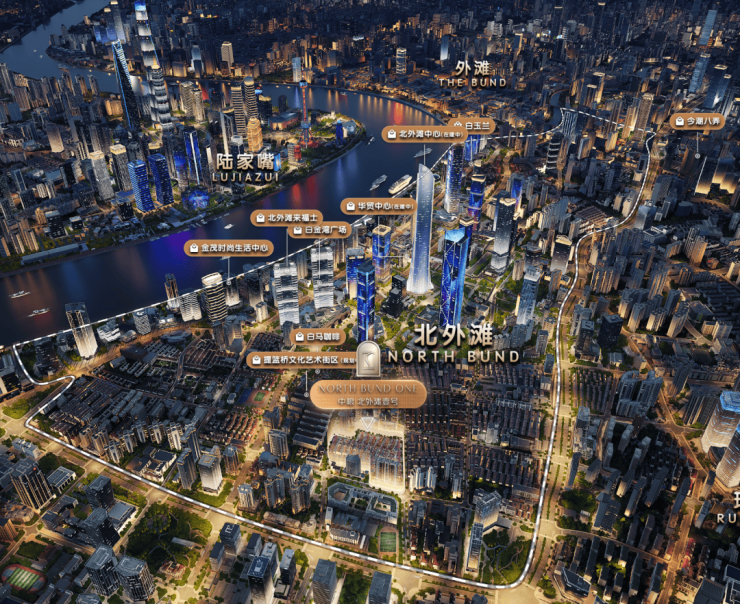 而北外滩又是黄浦江上的璀璨明珠,是“一江一河”战略的核心承载区,它与外滩、陆家嘴并列,形成“外滩-陆家嘴-北外滩”黄金三角,共同构成上海的世界级城市封面。