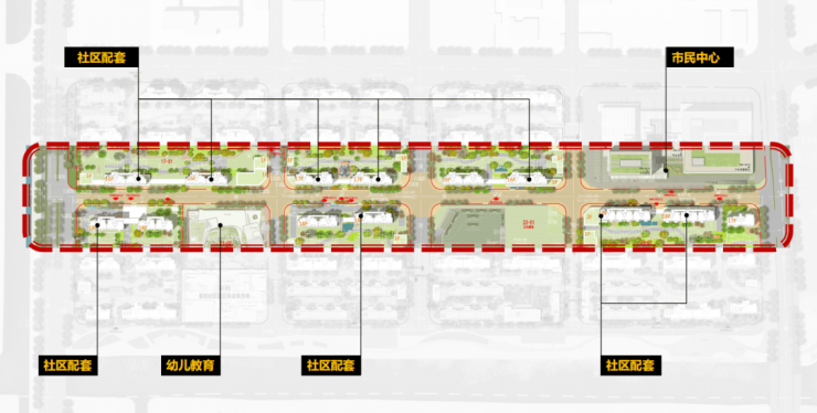 生活轴:在盈秀路街道两侧,创造丰富多样的生活配套设施,在一条道路上解决日常所需,形成适于步行的、紧凑的,混合使用的都市邻里单元。
