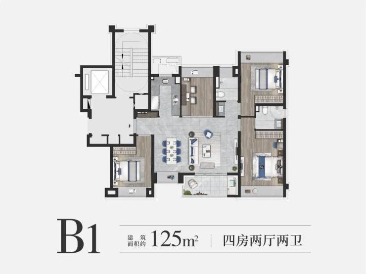 建面约125㎡的四房设计,在空间上使用功能更加扁平化,一站式解决了家庭生活的所有功能,优化居家动线,大大提升空间的居住体验。