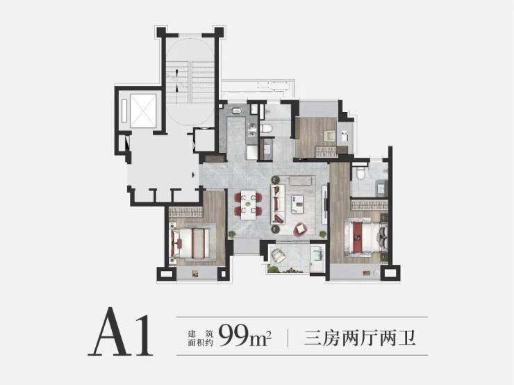 建面约99㎡3房(A1户型),做到了3.5开间朝南设计,整个户型几乎没有浪费面积~实现空间节约、居住升级等美好体验。