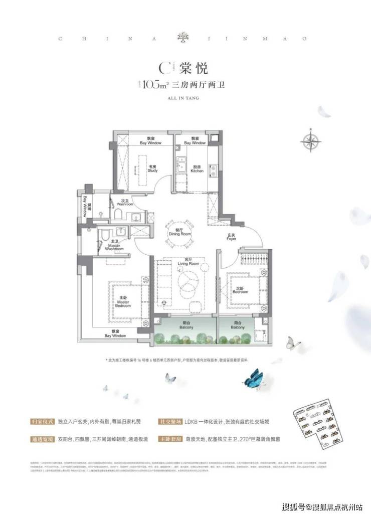 建面约105㎡3房2厅2卫,做到了三开间朝南+4个飘窗+双面阳台系统+主卧套房设计+270°转角飘窗,该户型的居住体验、舒适度、尺度感,是同级别产品所无法比拟的。