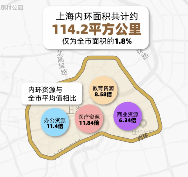 所有人都向往上海内环,内环内面积虽只占据上海1.8%的面积,却汇集了全上海最优质的资源——教育资源是全市平均值的8.58倍,医疗是11.84倍、商业6.34倍、办公11.4倍。(数据来源:上海统计年鉴)