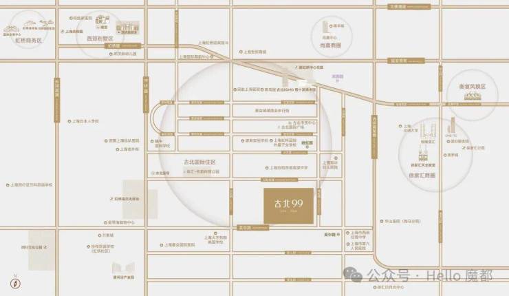 1-1.5公里步行圈:古北1699广场、黄金城道步行街、高岛屋、古北市民中心、体汇+名都体育公园、虹桥高尔夫球场、古北SOHO、程十发美术馆;