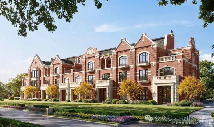 联排别墅采用英式维多利亚建筑风格,红砖与德国米黄干挂石材的搭配,形成温暖且经典的色调;经典长窗/方框窗/八角窗/拱形造型/坡屋面,赋予建筑精巧自然的美学质感。