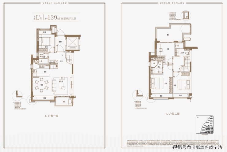 建面约139㎡上叠户型,三层是会客区,四层是居住区,阳台+露台+多个飘窗设计,附加空间非常大,在别墅类产品中实属罕见!