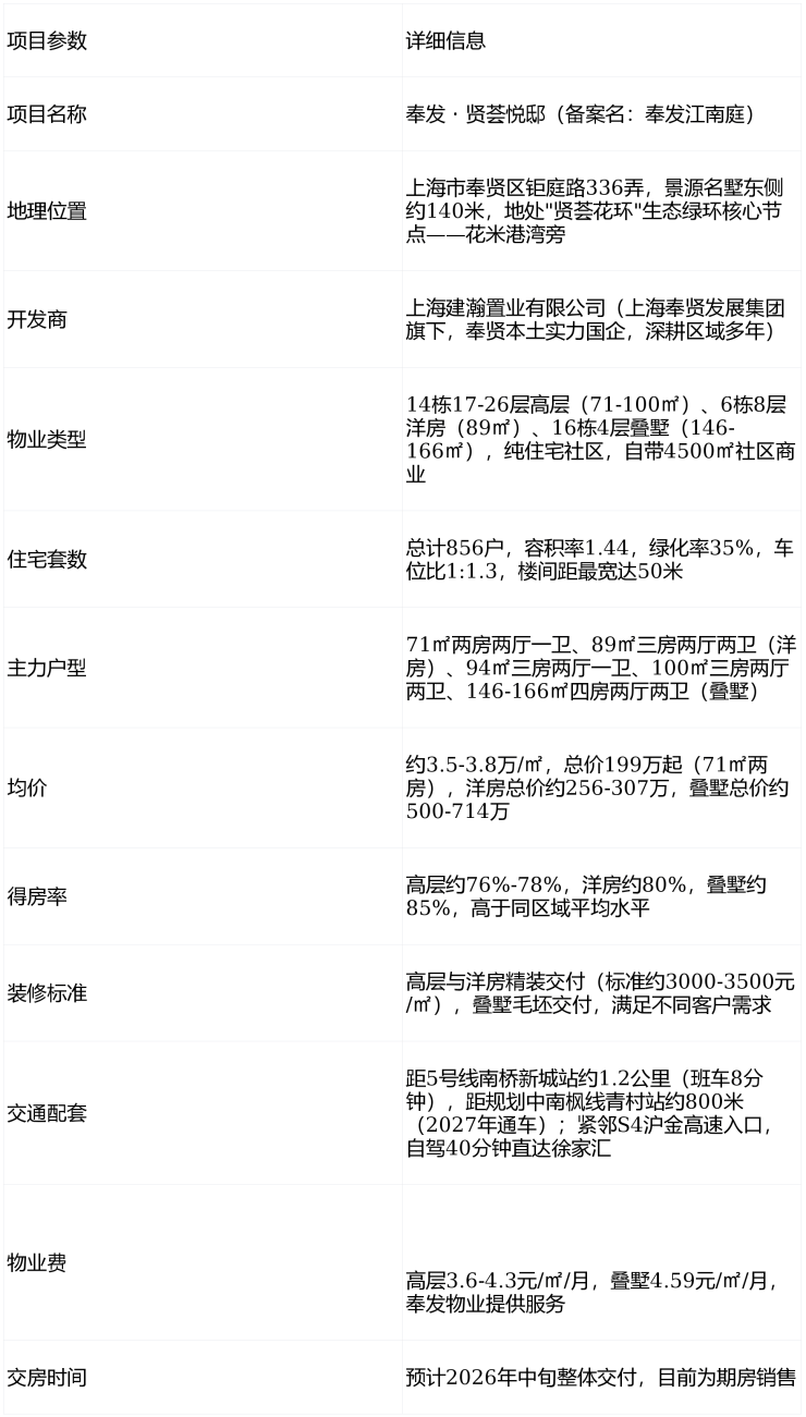 奉发贤荟悦邸是奉贤新城极具性价比的低密生态大盘,核心价值在于超低容积率1.44+国企交付保障+总价门槛低+户型多样的组合优势,适合预算200-700万、追求低密居住环境、首次置业或刚需改善的年轻家庭,尤其适合在奉贤、闵行工作生活的客户。