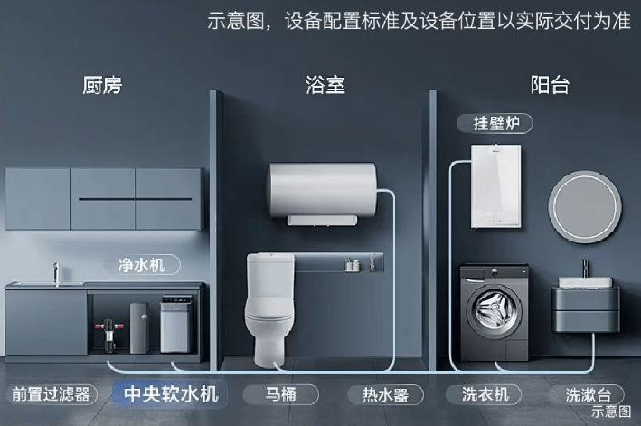 净源层面,通过全屋四层净水(前置+中央+末端+软水)以及316L医用级不锈钢水管,解决水质隐患的行业痛点。