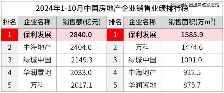 2024年,保利发展以强劲的韧性和央企坚实的底盘,位居中国房地产品牌价值榜首,荣膺“中国房地产行业领导公司品牌”TOP1荣誉奖项,1-10月销售业绩以2840亿大幅领先,入榜房企销售头排。