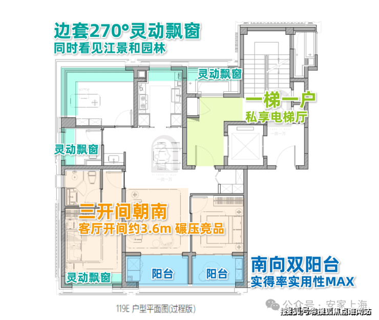 更大的亮点在于双转角飘窗与双阳台的多重暴击.