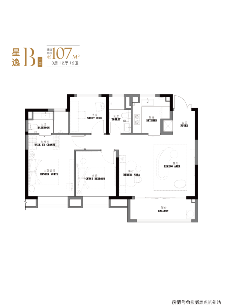 项目约103-107㎡3房2卫设计,有着宽绰的大横厅设计,并且3.5开间朝南。