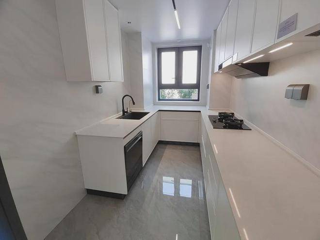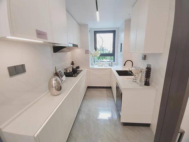 厨房U型操作台面,并配备了洗碗机、末端净水,甚至凉霸,不仅能解放双手,还解决了炎炎夏日厨房做饭闷热的烦恼;