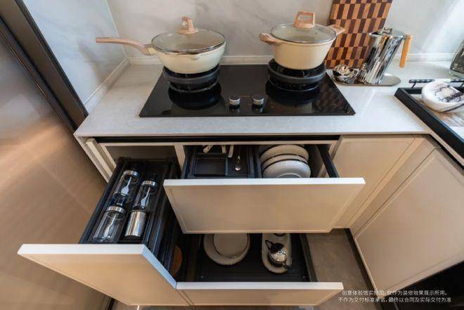 还配备大量收纳系统,例如多功能拉篮、定制光翻边造型柜体等。