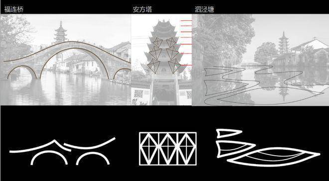 借鉴中国传统山水画卷以层叠构建景深的手法,转译窗、瓦、雨、桥和屋顶的元素符号,在南侧面向泗陈公路打造一幅沿城市主界面徐徐展开的泗泾水乡缩影。