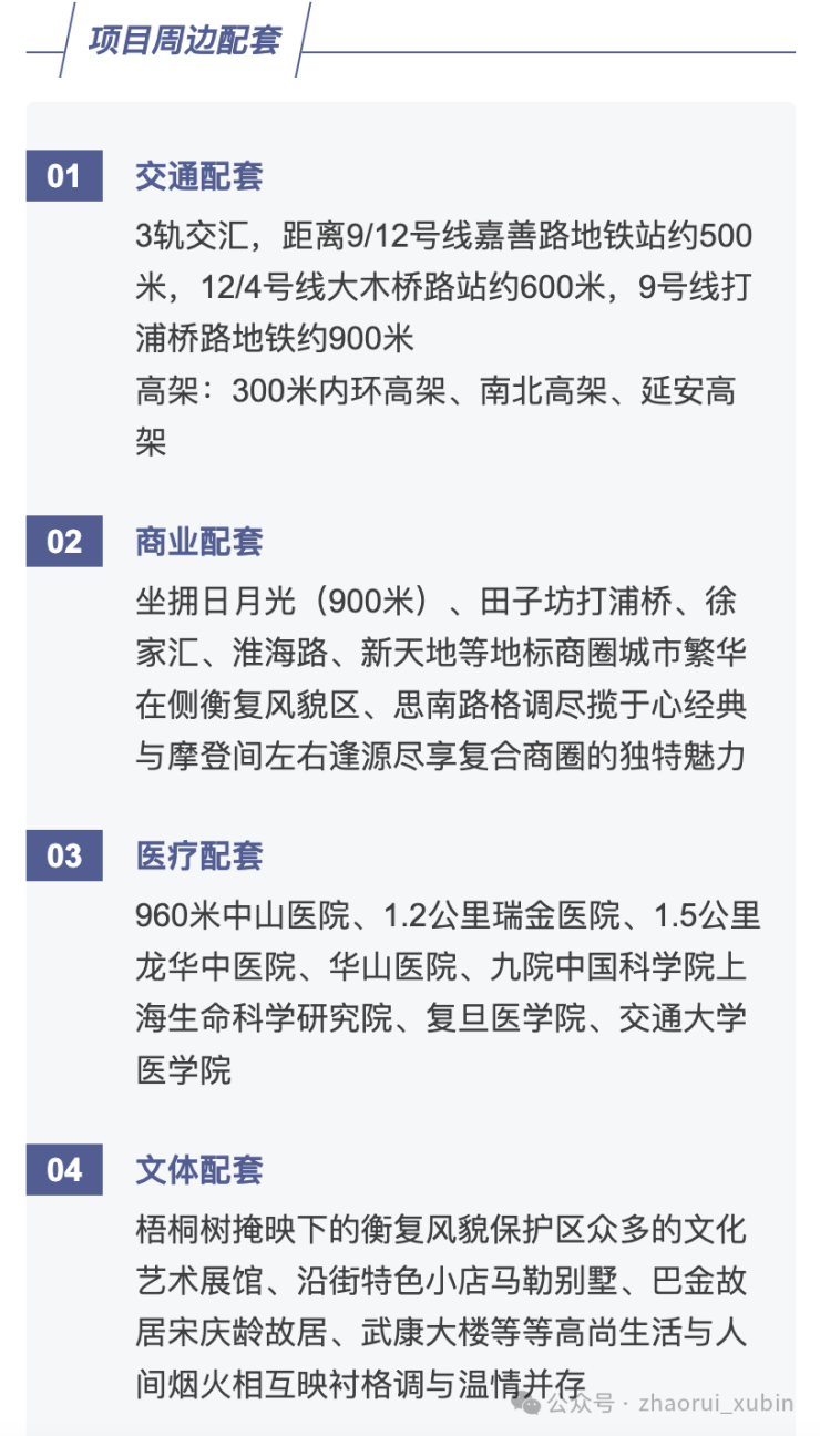 项目单价约为6.4万元/㎡,总价约1000万至1200万元,精装全配交付。交通方面,项目周边3轨交汇,距离地铁9/12号线嘉善路站仅400米,4号线大木桥路站600米,自驾出行也极为便利。商业配套方面,项目周边有日月光中心、田子坊、金玉兰广场等商业配套,满足购物、餐饮、娱乐等需求。此外,项目周边医疗资源丰富,生态配套完善,是追求高品质生活的理想之选。